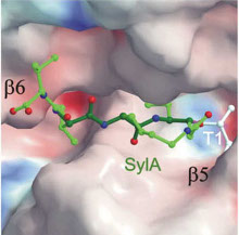 - Syringolin A covalently bound to the N-terminal Threonine (T1) of the catalytic beta-5 yeast proteasome subunit